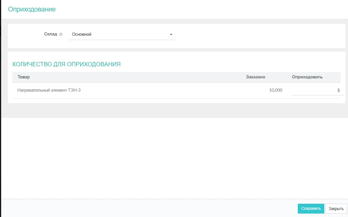 Когда товар от поставщика поступает на ваш склад, вы можете быстро его оприходовать напрямую из заказа:
