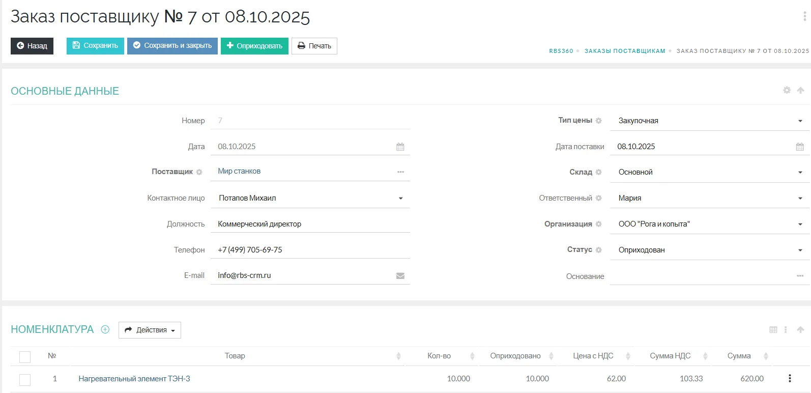 В документе «Заказ поставщику» нажмите кнопку «Оприходовать».