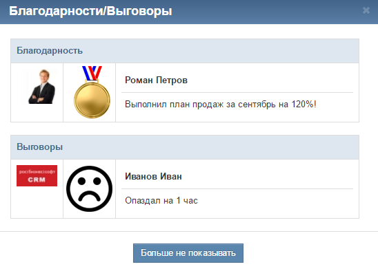 Компания РосБизнесСофт разработало новый модуль «Доска почета». При входе в программу «РосБизнесСофт CRM» каждый пользователь видит список отличившихся сотрудников и тех, кому был объявлен выговор. Срок размещения и за что благодарность/выговор задается в карточке «Сотрудника». Также есть возможность автоматического размещения сотрудников на «Доске почета» в зависимости от выполнения или невыполнения плана продаж (других показателей KPI). Модуль является дополнительным и приобретается отдельно.