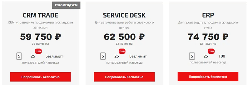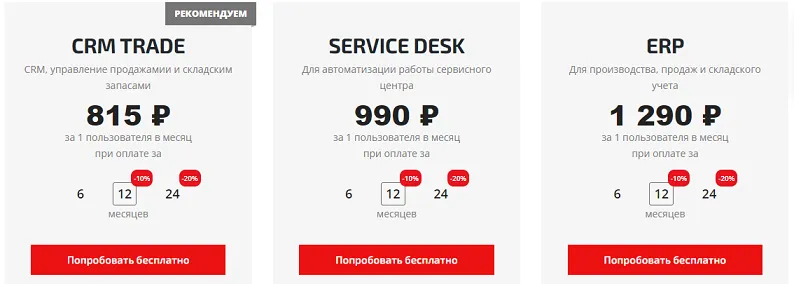 Мы отказались от тарифного плана «BASE». В будущем тариф «CRM Trade» будет заменен на «CRM». Также мы добавили скидки при оплате за 12 и 24 месяца. Минимальное количество лицензий, которые можно приобрести, стало 3. Кроме того, по просьбе клиентов мы снизили стоимость тарифа «ERP». Минимальный срок аренды остался прежним — 6 месяцев.