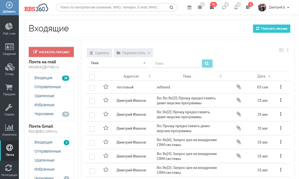 У нас для Вас отличные новости! Вы давно нас просили об этом, и мы это сделали! Встречайте новый встроенный почтовый модуль в новом релизе RBS360 (18.09). С этого момента Вы и Ваши сотрудники навсегда забудут про Outlook, Bat, Google и Yandex-почту. Вся переписка с клиентами и партнерами будет вестись только через RBS360.