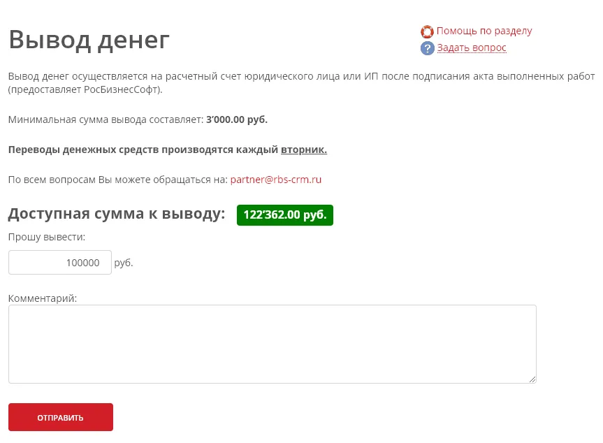 - Вы оформляете заявку на вывод денег в Личном кабинете партнера (не чаще 1 раза в месяц). Мы перечисляем вознаграждение на Ваш расчетный счет юридического лица или ИП. Минимальная сумма вывода — 3 000 руб.