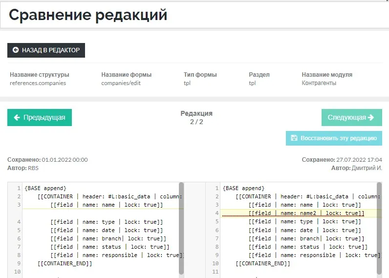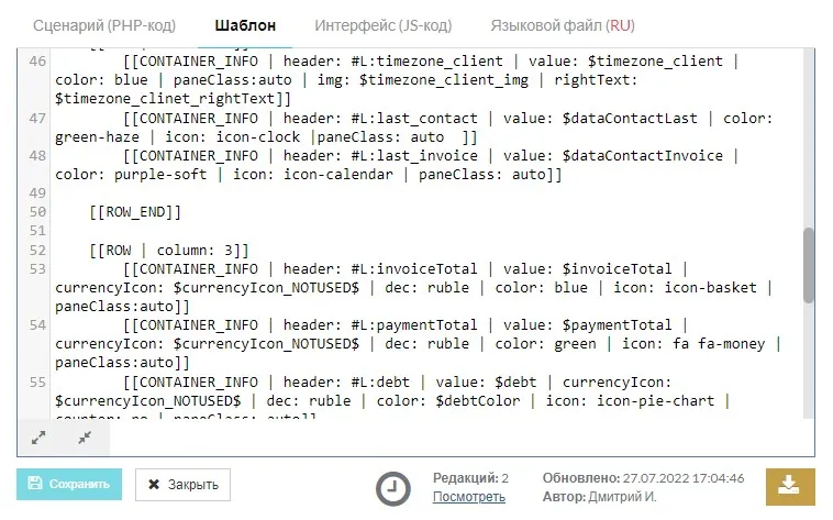Еще одно обновление коснулось формы «Редактирования кода». Теперь разработчикам видно, кто и когда вносил последние правки в код системы. Также добавили кнопку для сохранения кода себе на компьютер.