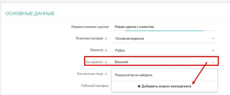 Ускоренное создание сделок. Форма добавления новой «Сделки» была значительно доработана. Теперь прямо из нее вы можете завести нового «Контрагента» и его «Контактное лицо», не прерывая основной процесс. Это делает ввод первичной информации более быстрым и удобным.