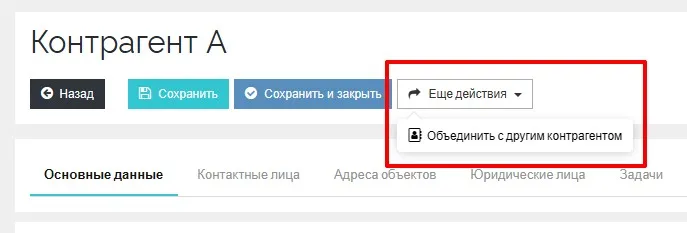 Работа с контрагентами стала гибче. Теперь вы можете легко объединять несколько контрагентов в один с помощью новой кнопки в карточке «Контрагента». Это поможет очистить базу данных от дубликатов и упорядочить информацию.